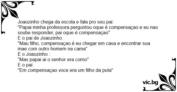 Joaozinho chega da escola e fala pro seu pai: "Papai minha professora perguntou oque é compensaçao e eu nao soube responder, pai oque é compensaçao" E o pai de Joaozinho: "Mau filho, compensaçao é eu chegar em casa e encontrar sua mae com outro homem na cama" E o Joaozinho : "Mas papai ai o senhor era соrnо" E o pai: "Em compensaçao voce era um filho da рuта"