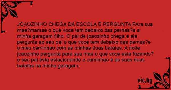 JOAOZINHO CHEGA DA ESCOLA E PERGUNTA PAra sua mae?mamae o que voce tem debaixo das pernas?e a minha garagem filho. O pai de joaozinho chega e ele pergunta ao seu pai o que voce tem debaixo das pernas?e o meu caminhao com as minhas duas batatas. A noite joaozinho pergunta para sua mae o que voce esta fazendo?o seu pai esta estacionando o caminhao e as suas duas batatas na minha garagem.