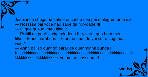 — Paiiiiii eu perdi a virgindadeee !!! Vivaa - que bom meu filho .. Meus parabens .. E entao quando vai ser a segunda vez ?