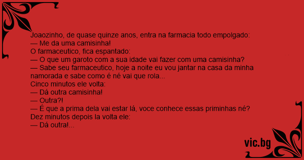 Joaozinho, de quase quinze anos, entra na farmacia todo empolgado: