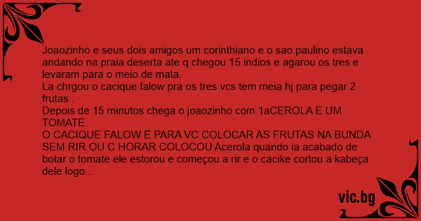 Joaozinho e seus dois amigos um corinthiano e o sao paulino estava andando na praia deserta ate q chegou 15 indios e agarou os tres e levaram para o meio de mata.
