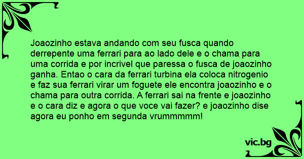 Joaozinho estava andando com seu fusca quando derrepente uma ferrari para ao lado dele e o chama para uma corrida e por incrivel que paressa o fusca de joaozinho ganha. Entao o cara da ferrari turbina ela coloca nitrogenio e faz sua ferrari virar um foguete ele encontra joaozinho e o chama para outra corrida. A ferrari sai na frente e joaozinho e o cara diz e agora o que voce vai fazer? e joaozinho dise agora eu ponho em segunda vrummmmm!