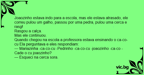 — Mariazinha -ca-co-cu -Pedrinho -ca-co-cu -joaozinho -ca-co -Cade o cu joaozinho?