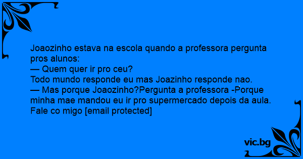 — Mas porque Joaozinho?Pergunta a professora -Porque minha mae mandou eu ir pro supermercado depois da aula.