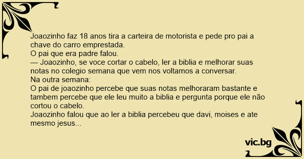 O pai de joaozinho percebe que suas notas melhoraram bastante e tambem percebe que ele leu muito a biblia e pergunta porque ele não cortou o cabelo.