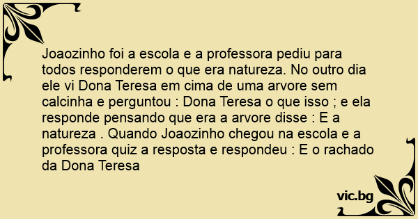 Joaozinho foi a escola e a professora pediu para todos responderem o que era natureza. No outro dia ele vi Dona Teresa em cima de uma arvore sem calcinha e perguntou : Dona Teresa o que isso ; e ela responde pensando que era a arvore disse : E a natureza . Quando Joaozinho chegou na escola e a professora quiz a resposta e respondeu : E o rachado da Dona Teresa