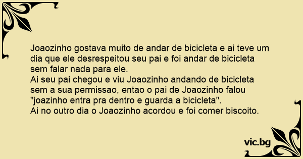 Ai seu pai chegou e viu Joaozinho andando de bicicleta sem a sua permissao, entao o pai de Joaozinho falou "joazinho entra pra dentro e guarda a bicicleta".
