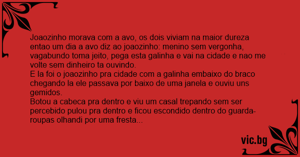 E la foi o joaozinho pra cidade com a gаlinhа embaixo do braco chegando la ele passava por baixo de uma janela e ouviu uns gemidos.