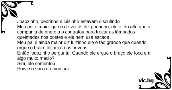 Meu pai e maior que o de voces diz pedrinho, ele é tão alto que a compania de energia o contratou para trocar as lâmpadas queimadas nos postes e ele nem usa escada.