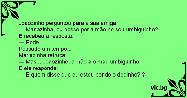 Joãozinho encontra a Mariazinha e fala: — Mariazinha, posso colocar meu dedinho no seu umbiguinho? — Pode. De repente a Mariazinha diz: — Joãozinho, esse não é meu umbiguinho. Joãozinho responde: — Nem esse daqui é meu dedinho.