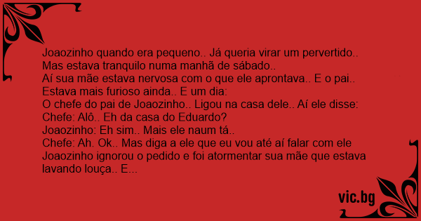 Chefe: Ah. Ok.. Mas diga a ele que eu vou até aí falar com ele Joaozinho ignorou o pedido e foi atormentar sua mãe que estava lavando louça.. E perguntou: