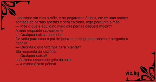Joaozinho sai com a mãe, e ao pegarem o ônibus, ele vê uma mulher sentada de pernas abertas e sem calcinha, logo pergunta a mãe: