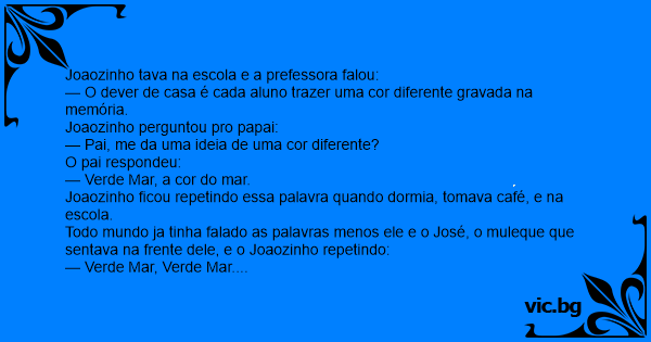 Dae chegou a vez du muleke da frente q era nego, dae ele ouviu Joaozinho falando verde mar e falou verde mar.