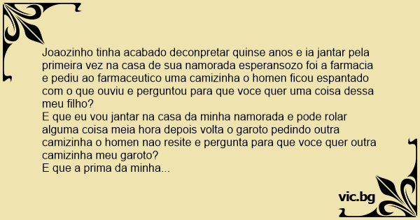 E que a prima da minha namorada vai ta la e se sabe ne pode rolar meia hоrа mais tarde volta o garoto querendo mais uma outra ves a pergunta eo garoto responde e que minha sogra vai ta la e pode rolar um bacanal e ja viu a noite quando conheseu a familha de sua namorada e descobriu que o farmaseutico era o pai dela ficou muito sen grasa equieto enquanto jantavao a menina pergunta joaozinho porque esta tao quieto?