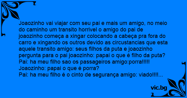 Joaozinho vai viajar com seu pai e mais um amigo, no meio do caminho um transito horrivel o amigo do pai de joaozinho começa a xingar colocando a cabeça pra fora do carro e xingando os outros devido as circustancias que esta aquele transito amigo: seus filhos da рuта e joaozinho pergunta para o pai joaozinho: papai o que é filho da рuта?