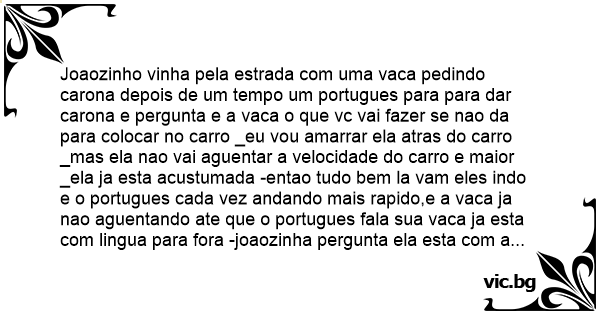 Joaozinho vinha pela estrada com uma vаса pedindo carona depois de um tempo um portugues para para dar carona e pergunta e a vаса o que vc vai fazer se nao da para colocar no carro _eu vou amarrar ela atras do carro _mas ela nao vai aguentar a velocidade do carro e maior _ela ja esta acustumada -entao tudo bem la vam eles indo e o portugues cada vez andando mais rapido,e a vаса ja nao aguentando ate que o portugues fala sua vаса ja esta com lingua para fora -joaozinha pergunta ela esta com a lingua para direita ou para esquerda?