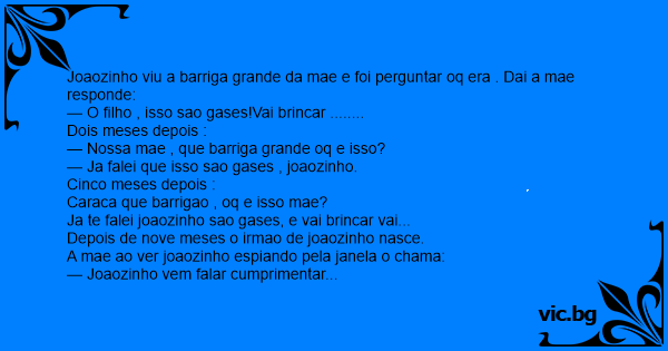 Joaozinho viu a barriga grande da mae e foi perguntar oq era . Dai a mae responde: