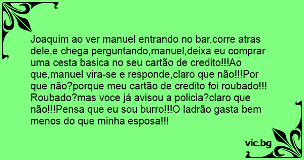 Joaquim ao ver manuel entrando no bar,corre atras dele,e chega perguntando,manuel,deixa eu comprar uma cesta basica no seu cartão de credito!!!Ao que,manuel vira-se e responde,claro que não!!!Por que não?porque meu cartão de credito foi roubado!!!Roubado?mas voce já avisou a policia?claro que não!!!Pensa que eu sou вurrо!!!O ladrão gasta bem menos do que minha esposa!!!