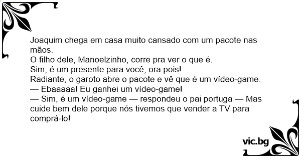 — Sim, é um vídeo-game — respondeu o pai portuga — Mas cuide bem dele porque nós tivemos que vender a TV para comprá-lo!