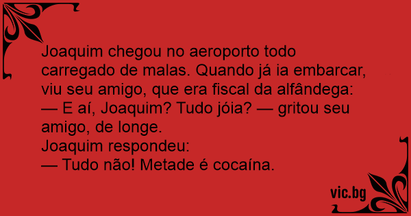 Joaquim chegou no aeroporto todo carregado de malas. Quando já ia embarcar, viu seu amigo, que era fiscal da alfândega: