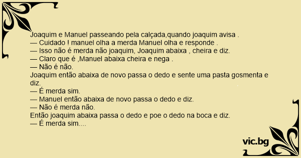 — Isso não é меrdа não joaquim, Joaquim abaixa , cheira e diz.