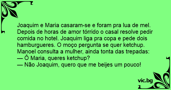 Joaquim e Maria casaram-se e foram pra lua de mel. Depois de horas de amor tórrido o casal resolve pedir comida no hotel. Joaquim liga pra copa e pede dois hamburgueres. O moço pergunta se quer ketchup. Manoel consulta a mulher, ainda tonta das trepadas: