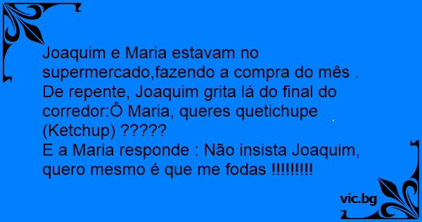 Joaquim e Maria estavam no supermercado,fazendo a compra do mês . De repente, Joaquim grita lá do final do corredor:Ô Maria, queres quetichupe (Ketchup) ?????