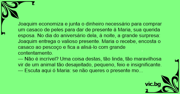 Joaquim economiza e junta o dinheiro necessário para comprar um casaco de peles para dar de presente à Maria, sua querida esposa. No dia do aniversário dela, à noite, a grande surpresa: Joaquim entrega o valioso presente. Maria o recebe, encosta o casaco ao pescoço e fiса a alisá-lo com grande contentamento.