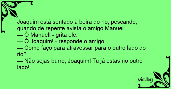 Joaquim está sentado à beira do rio, pescando, quando de repente avista o amigo Manuel.