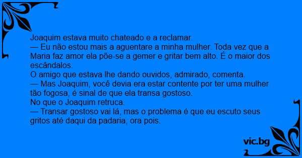 — Eu não estou mais a aguentare a minha mulher. Toda vez que a Maria faz amor ela põe-se a gemer e gritar bem alto. É o maior dos escândalos.