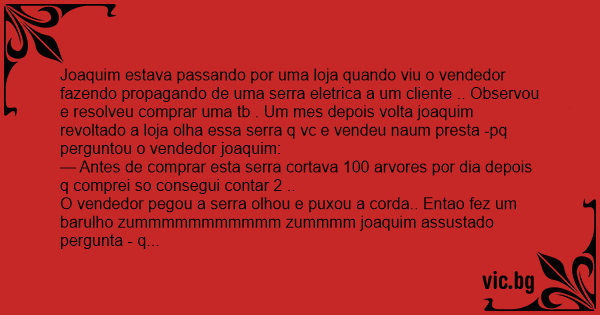 Joaquim estava passando por uma loja quando viu o vendedor fazendo propagando de uma serra eletrica a um cliente .. Observou e resolveu comprar uma tb . Um mes depois volta joaquim revoltado a loja olha essa serra q vc e vendeu naum presta -pq perguntou o vendedor joaquim: