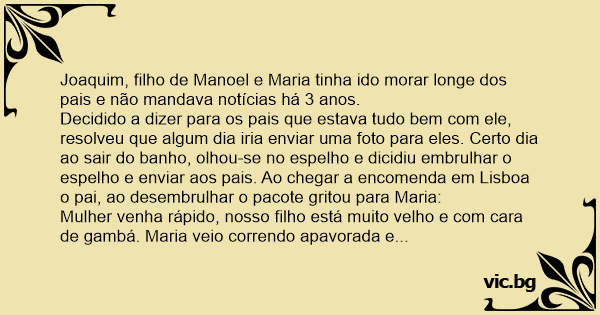 Decidido a dizer para os pais que estava tudo bem com ele, resolveu que algum dia iria enviar uma foto para eles. Certo dia ao sair do banho, olhou-se no espelho e dicidiu embrulhar o espelho e enviar aos pais. Ao chegar a encomenda em Lisboa o pai, ao desembrulhar o pacote gritou para Maria: