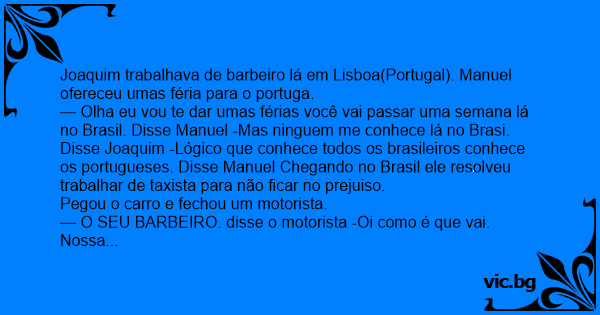 — Olha eu vou te dar umas férias você vai passar uma semana lá no Brasil. Disse Manuel -Mas ninguem me conhece lá no Brasi. Disse Joaquim -Lógico que conhece todos os brasileiros conhece os portugueses. Disse Manuel Chegando no Brasil ele resolveu trabalhar de taxista para não ficar no prejuiso.
