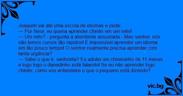 — Um mês? - pergunta a atendente assustada - Meu senhor, nós não temos cursos tão rápidos! É impossível aprender um idioma em tão pouco tempo! O senhor realmente precisa aprender com tanta urgência?