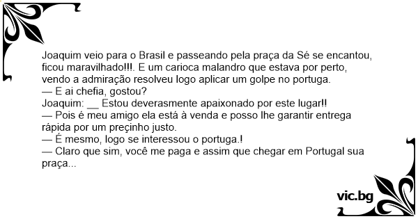 Joaquim veio para o Brasil e passeando pela praça da Sé se encantou, ficou maravilhado!!!. E um carioca malandro que estava por perto, vendo a admiração resolveu logo aplicar um golpe no portuga.