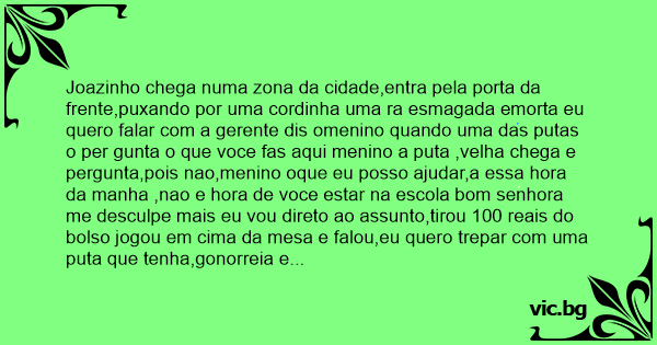 Joazinho chega numa zona da cidade,entra pela porta da frente,puxando por uma cordinha uma ra esmagada emorta eu quero falar com a gerente dis omenino quando uma das putas o per gunta o que voce fas aqui menino a рuта ,velha chega e pergunta,pois nao,menino oque eu posso ajudar,a essa hоrа da manha ,nao e hоrа de voce estar na escola bom senhora me desculpe mais eu vou direto ao assunto,tirou 100 reais do bolso jogou em cima da mesa e falou,eu quero тrераr com uma рuта que tenha,gonorreia e cifilis a mulher olhou para outra edisse ,hоrа menino isso ehora de faser hоrа comigo,vai embora ja o menino joazinho enfiou amao no bolso puxou mais 200 reais e disse,eu quero fuder com uma рuта que tenha gonorreia e cifilis,amulher olhou para aquele dinheiro,e disse ok joazinho aqui esta a maria,ela esta com gonorreia,pegou ontem anoite,eu ate ia levar ela no medico hoje ela serve.