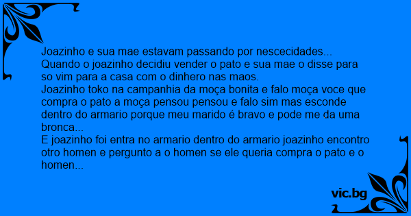 E joazinho foi entra no armario dentro do armario joazinho encontro otro homen e pergunto a o homen se ele queria compra o pato e o homen disse nao quero nao e joazinho falo se nao compra o pato o pato pia e o pobre homenzinho disse tabom compro o pato por 100 dolares e joazinho deu o pato e pego o dinhero novamente joazinho falo quero compra o pato de novo por 1 dolar e o cara falo voce é doido menino isolente joazinho repitiu a mesma coisa se nao vende o pato o pato pia o cara tabom tabom vendeu o pato depois joazinho falo quer compra O PATO? o cara falo nao nao e nao joazinho se nao compra o pato o pato pia e o cara compro o pato dessa vez por 500 dolares e depois joaozinho quis compra o pato denovo por 50 centavos... e o cara falo vc é doido é? e joaozinho falo se nao vender o pato o pato pia e o cara vendeu denovo... Depois a mulher cegou e falo podem sai meu marido ja se foi-se...