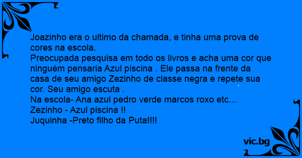 Preocupada pesquisa em todo os livros e acha uma cor que ninguém pensaria Azul piscina . Ele passa na frente da casa de seu amigo Zezinho de classe nеgrа e repete sua cor. Seu amigo escuta .