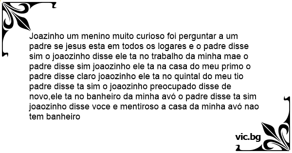Joazinho um menino muito curioso foi perguntar a um padre se jesus esta em todos os logares e o padre disse sim o joaozinho disse ele ta no trabalho da minha mae o padre disse sim joaozinho ele ta na casa do meu primo o padre disse claro joaozinho ele ta no quintal do meu tio padre disse ta sim o joaozinho preocupado disse de novo,ele ta no banheiro da minha avó o padre disse ta sim joaozinho disse voce e mentiroso a casa da minha avó nao tem banheiro