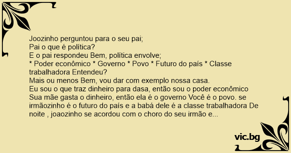 O filho fala para o pai: — Pai, eu preciso fazer um trabalho para a escola, posso te fazer uma pergunta? — Claro meu filho. Qual é a pergunta? — O que é Política, pai? — Bem, vou usar a nossa casa...