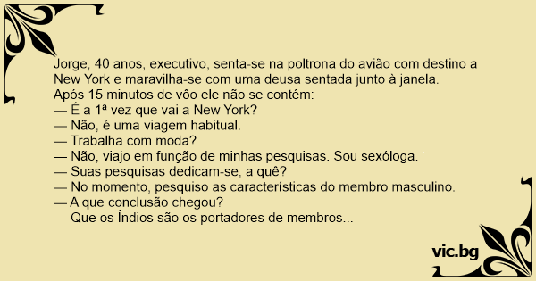 — Que os Índios são os portadores de membros com as dimensões mais avantajadas e os Árabes são os que permanecem mais tempo no coito. Logo, são eles que proporcionam mais prazer às suas parceiras. Desculpe-me Senhor, eu estou aqui falando mas não sei o seu nome...
