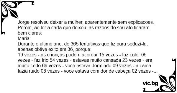 Durante o ultimo ano, de 365 tentativas que fiz para seduzí-la, apenas obtive exito em 36, porque: