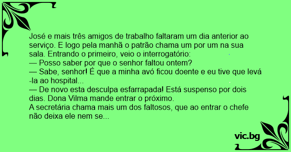 — Até você José, faltando? Quero saber qual é a sua desculpa? E não me venha com história de avó ou mãe doente.
