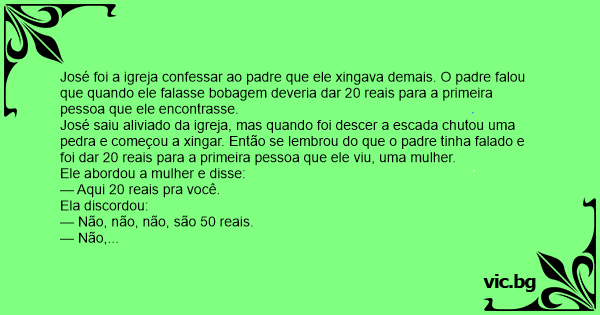 José foi a igreja confessar ao padre que ele xingava demais. O padre falou que quando ele falasse bobagem deveria dar 20 reais para a primeira pessoa que ele encontrasse.