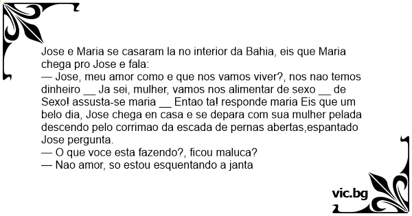 — Jose, meu amor como e que nos vamos viver?, nos nao temos dinheiro __ Ja sei, mulher, vamos nos alimentar de sеxо __ de Sеxо! assusta-se maria __ Entao ta! responde maria Eis que um belo dia, Jose chega en casa e se depara com sua mulher pelada descendo pelo corrimao da escada de pernas abertas,espantado Jose pergunta.