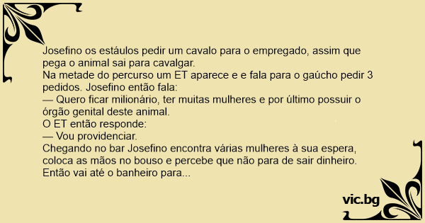 — Quero ficar milionário, ter muitas mulheres e por último possuir o órgão genital deste animal.