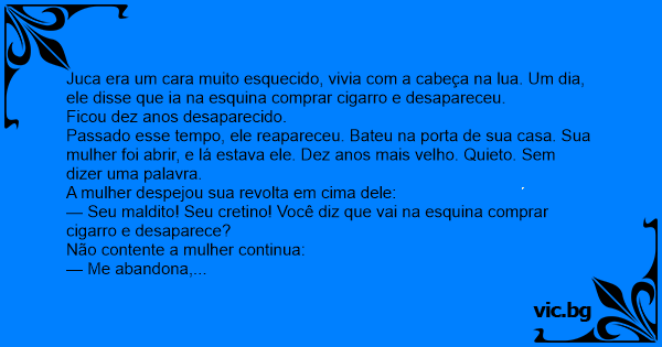 Juca era um cara muito esquecido, vivia com a cabeça na lua. Um dia, ele disse que ia na esquina comprar cigarro e desapareceu.