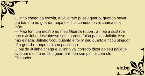 — Mãe tem um mostro no meu Guarda-roupa , a mãe a sustada que o Julinho descobrisse seu segredo falou p/ ele - Julinho isso não é nada. Julinho ficou quiento e foi p/ seu quarto e ficou olhador p/ o guarda- roupa até seu pai chega.