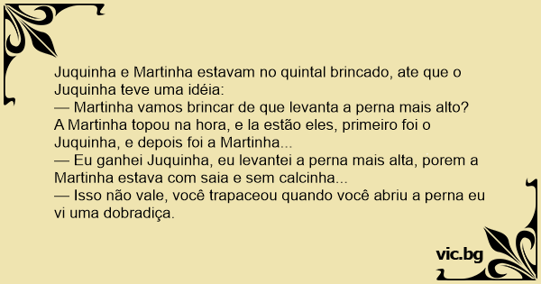— Eu ganhei Juquinha, eu levantei a perna mais alta, porem a Martinha estava com saia e sem calcinha...