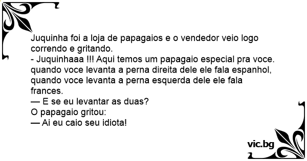 Uma senhora entrou em uma avicultura e viu um papagaio com uma correntinha em cada pé. Muito curiosa, chamou o balconista e foi logo perguntando: — Ei, moço qual a função das duas correntinhas do...